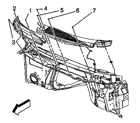 2. Remove the screws (1-7), retaining the air inlet grille panels to the cowl vent.