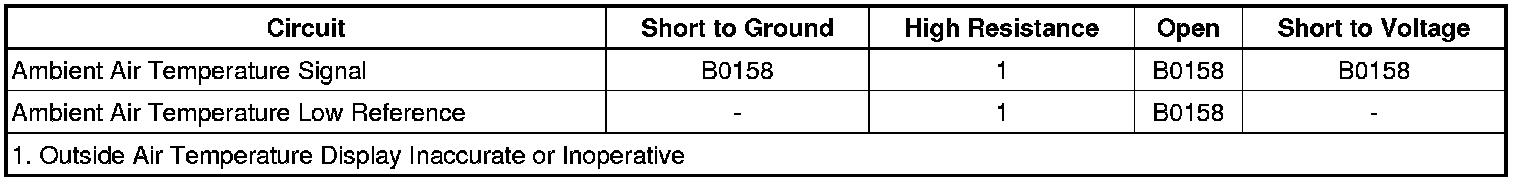 The following table will be used to measure the resistance of the ambient air temperature sensor and compare it with the actual ambient temperature. The driver information center (DIC) temperature display accuracy should be within 5 degrees of the actual temperature. The actual temperature should not be taken from a radio station, a sign displaying the temperature, etc. A temperature measuring tool such as a thermometer should be used. Some temperature measuring tools may be within 5 degrees of the actual temperature. Make sure to consult the manufacturer for the accuracy of the tool. This comparison can make the DIC temperature display seem off by 5-10 degrees of the actual temperature when it is not.