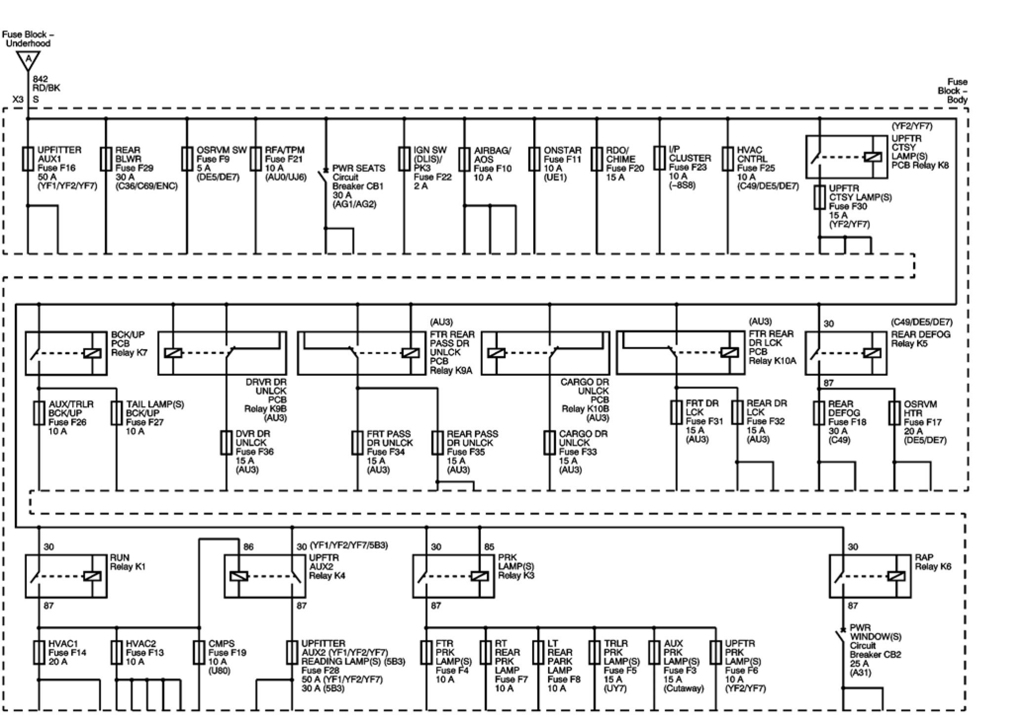FRT DR LCK, REAR DR LCK and UPFITTER AUX1 Fuses