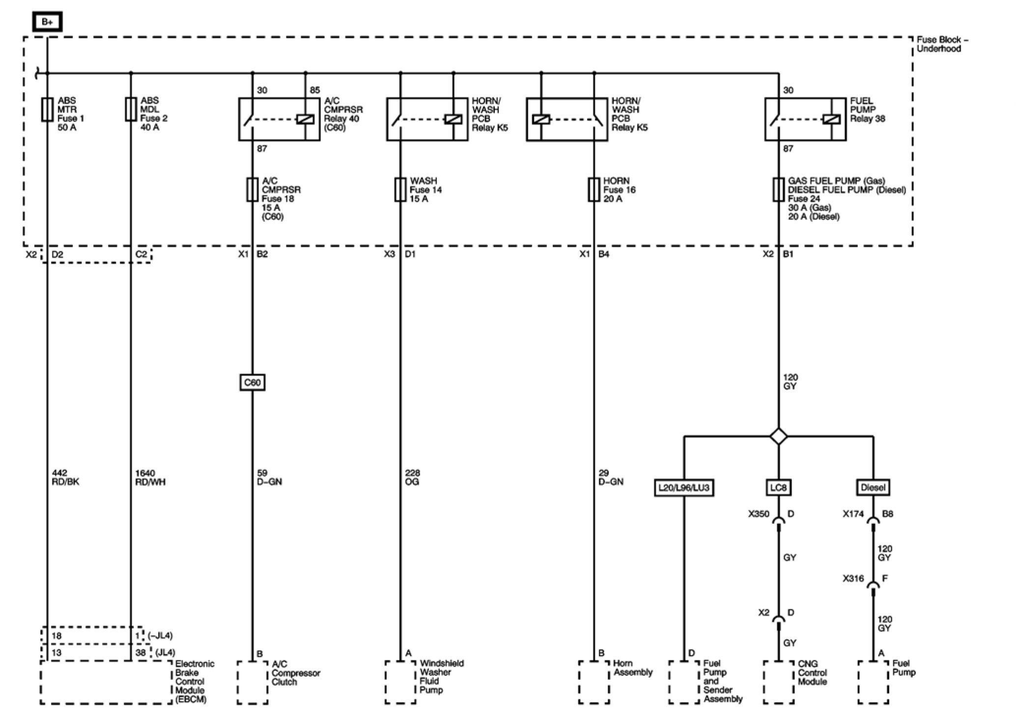 A/C CMPRSR, ABS MDL, ABS MTR, DIESEL FUEL PUMP, GAS FUEL PUMP, HORN, and WASH Fuses