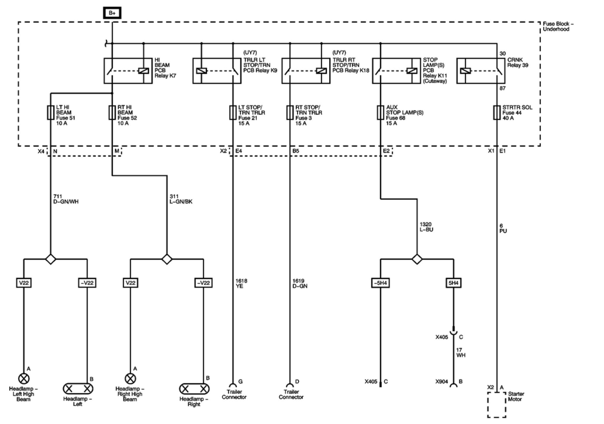 AUX STOP LAMP(S), LT HI BEAM, LT STOP/TRN TRLR, RT HI BEAM, RT STOP/TRN TRLR, and STRTR SOL Fuses