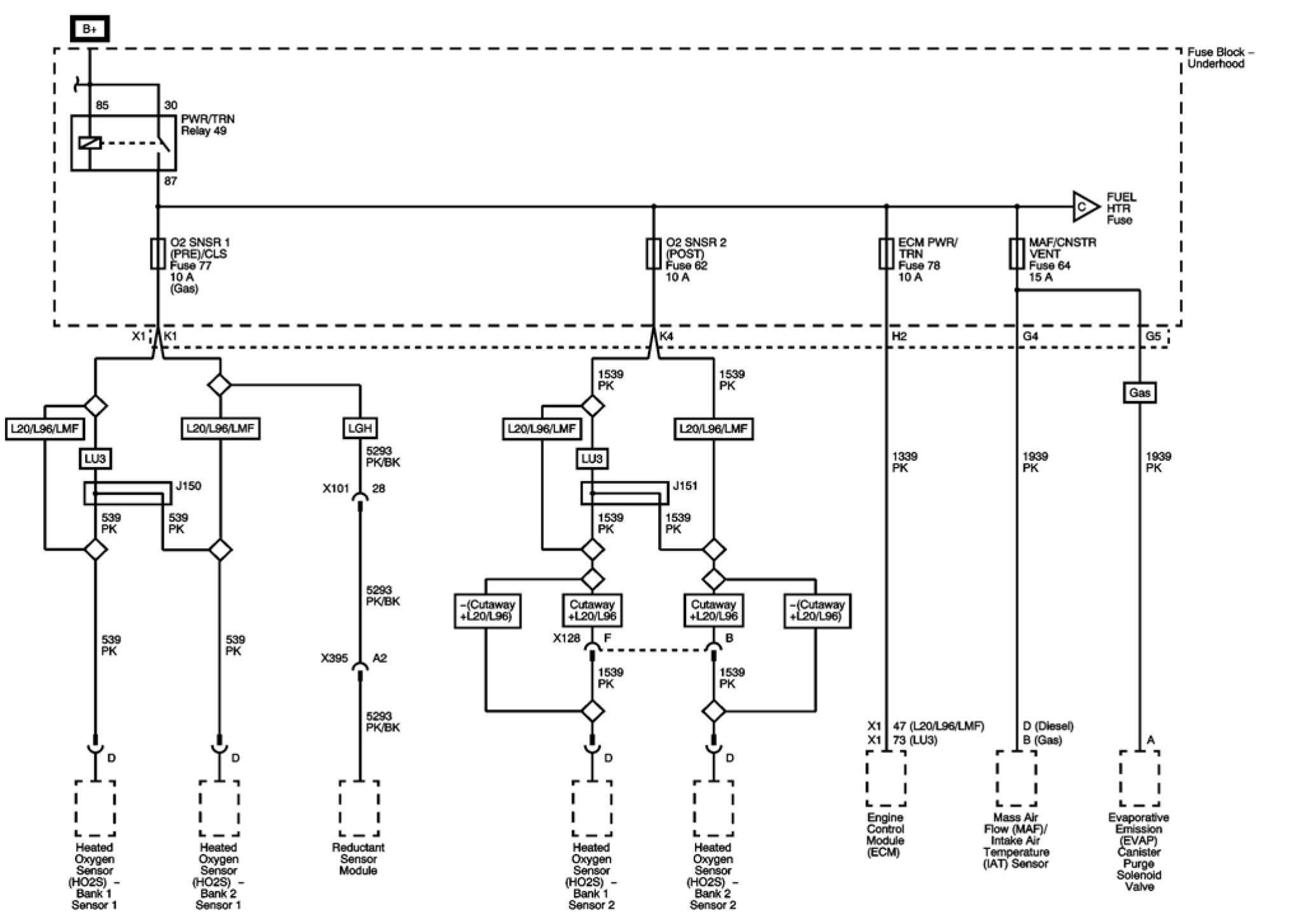 ECM PWR/TRN, MAF/CNSTR VENT, O2 SNSR 1 (PRE)/CLS, and O2 SNSR 2 (POST) Fuses