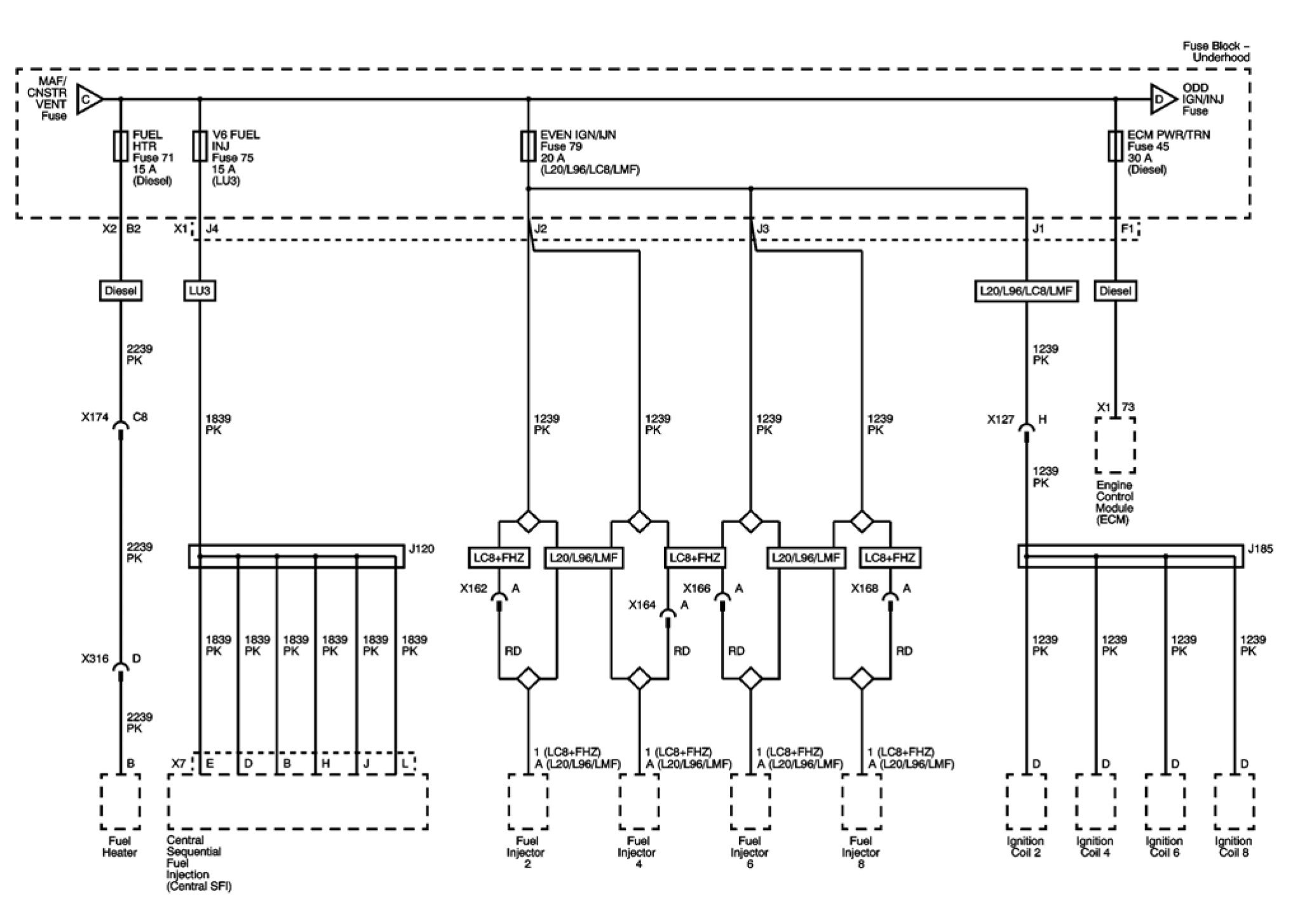 ECM PWR/TRN, EVEN IGN/IJN, FUEL HTR, and V6 FUEL INJ Fuses