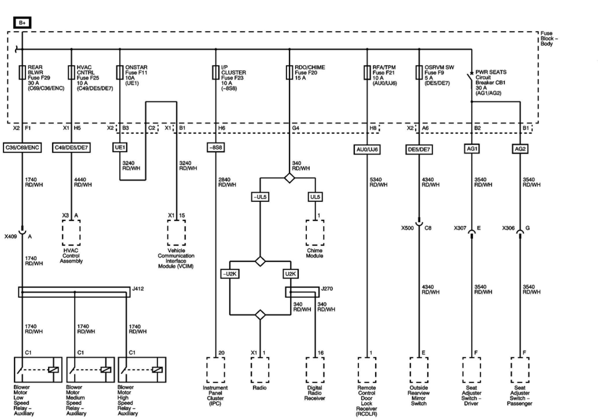 HVAC CNTRL, I/P CLUSTER, ONSTAR, OSRVM SW, RDO/CHIME, REAR BLWR, and RFA/TPM Fuses and PWR SEATS Circuit Breaker