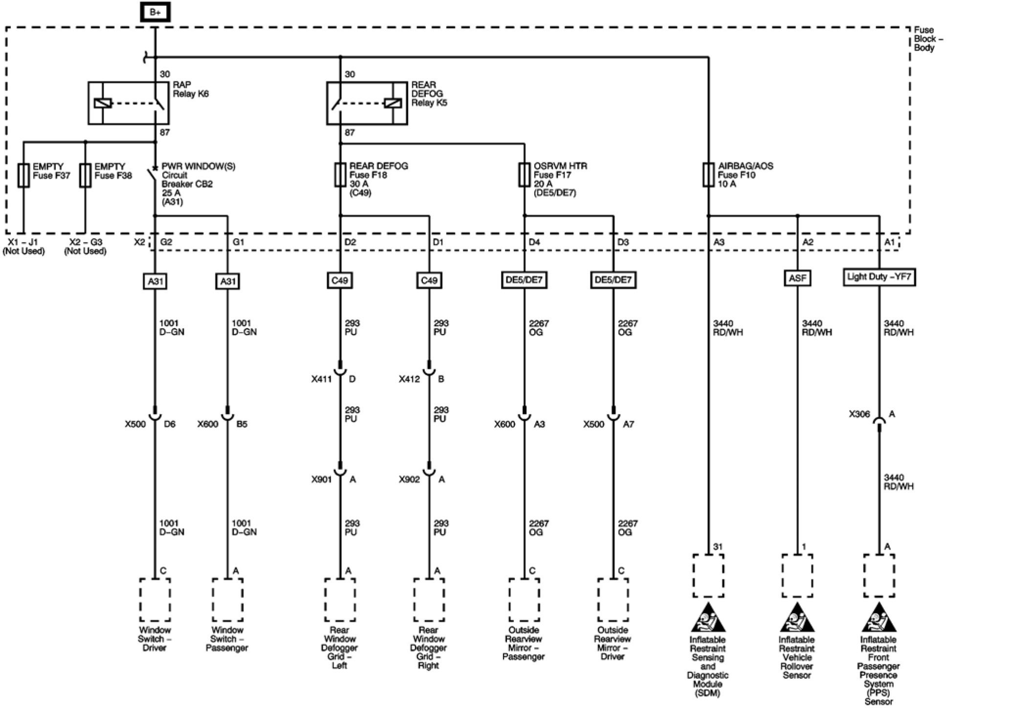 AIRBAG/AOS, OSRVM HTR, and REAR DEFOG Fuses and PWR WINDOW(S) Circuit Breaker
