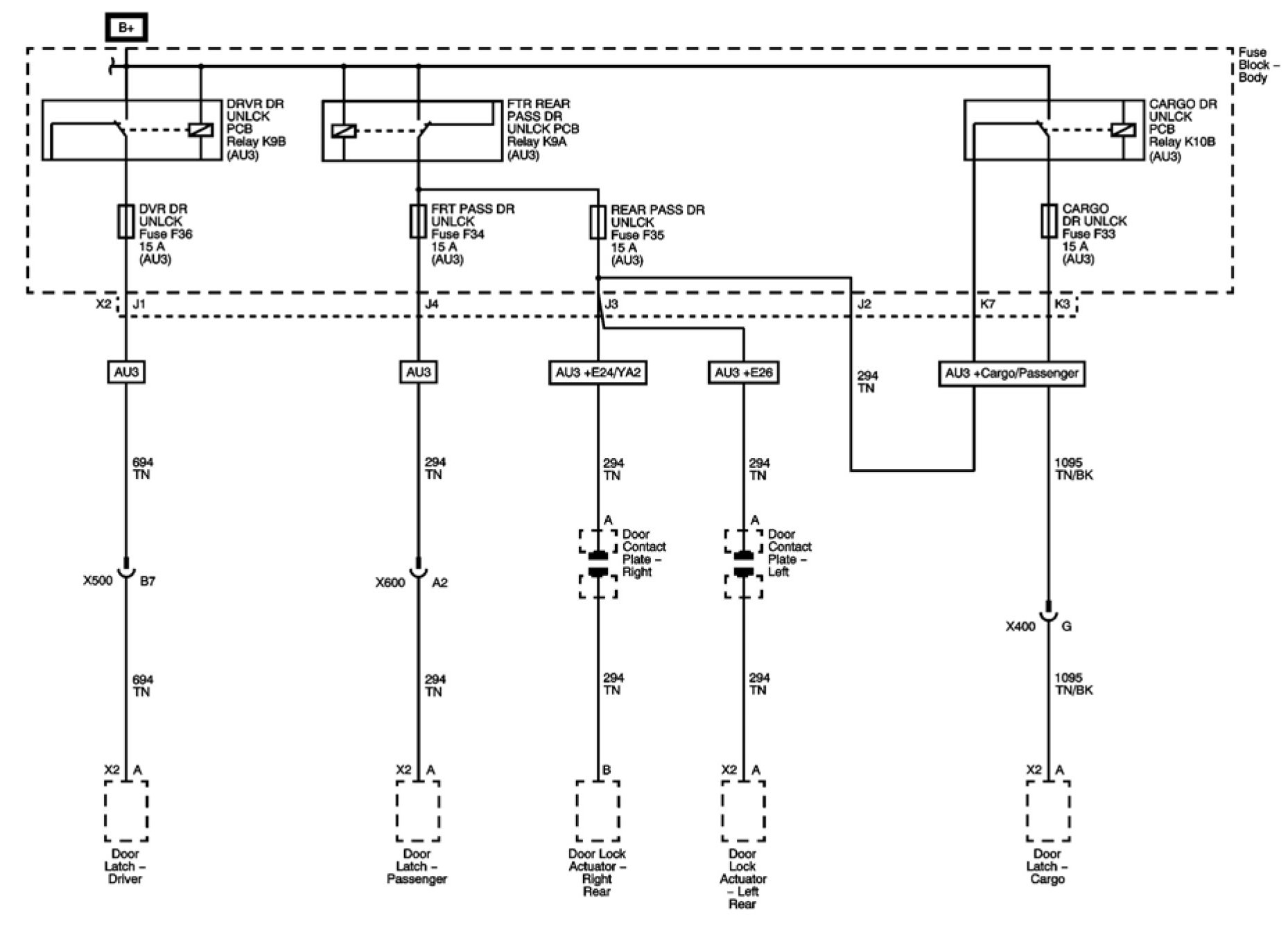 CARGO DR UNLCK, DVR DR UNLCK, FRT PASS DR UNLCK and REAR PASS DR UNLCK Fuses