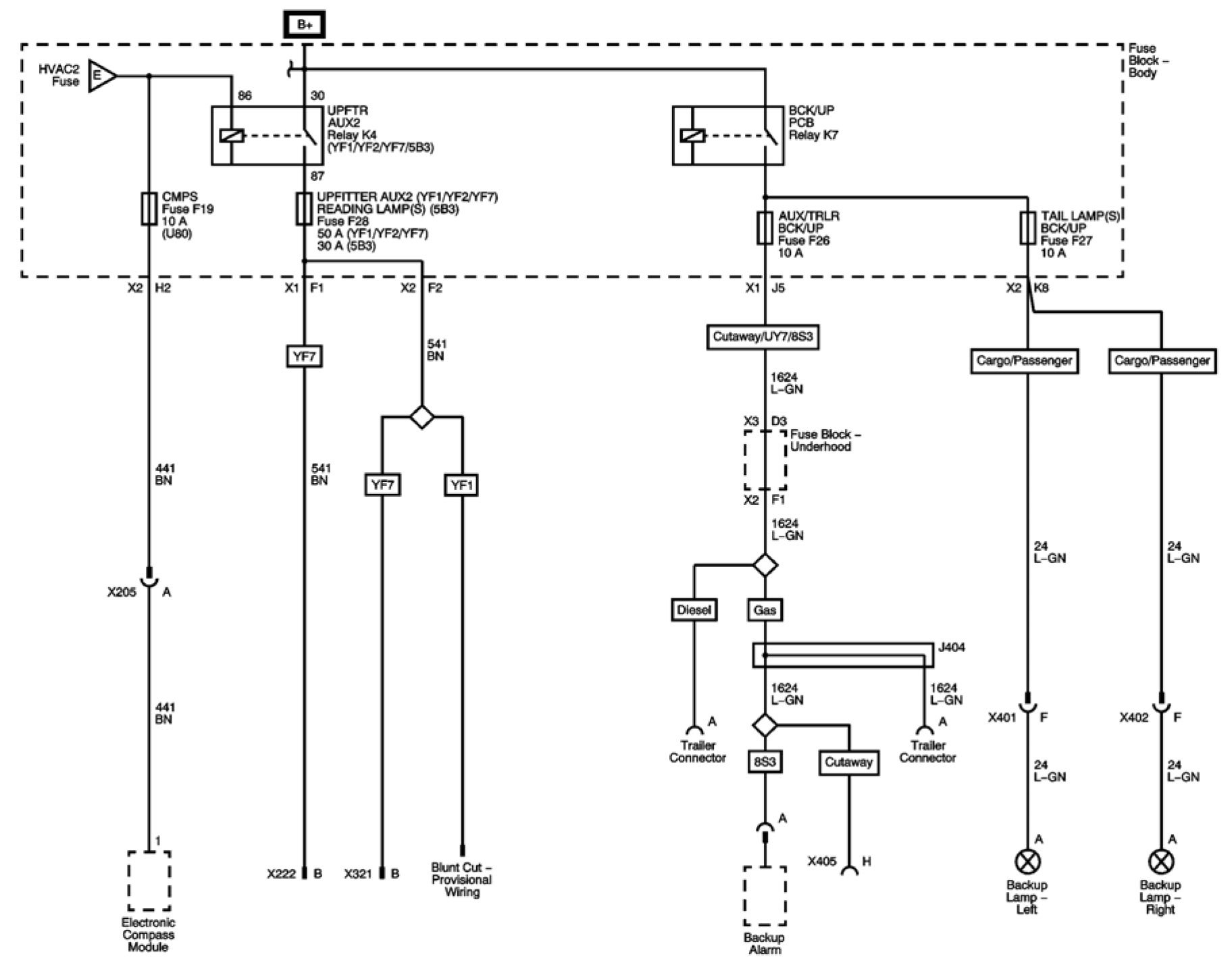 AUX/TRLR BCK/UP, CMPS, READING LAMPS(S), TAIL LAMP(S), and UPFITTER AUX2 Fuses