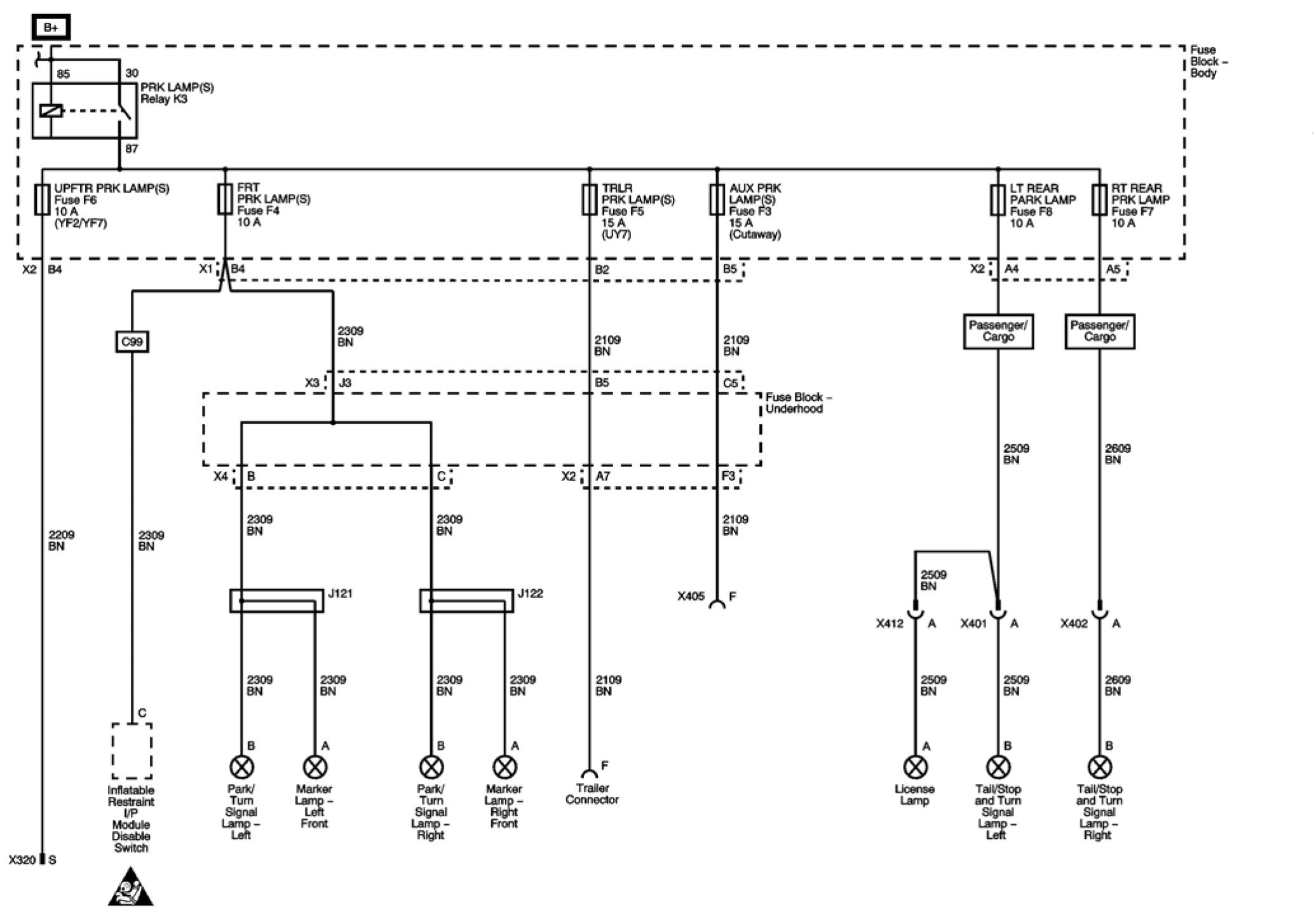 AUX PRK LAMP(S), FRT PRK LAMP(S), LT REAR PARK LAMP, RT REAR PRK LAMP, TRLR PRK LAMP(S), and UPFTR PRK LAMP(S) Fuses