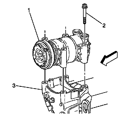 2. Install the compressor retaining bolts to the mounting bracket and tighten to 50 Nm (37 lb ft).