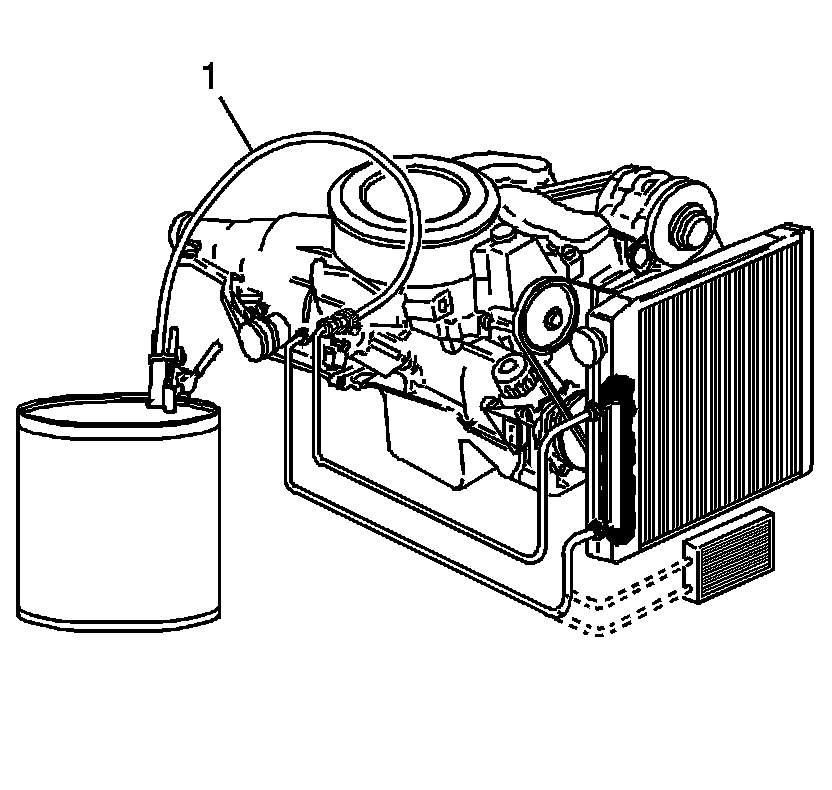 1. Disconnect the J 35944-A - oil cooler flusher discharge hose (1) from the oil cooler return pipe.