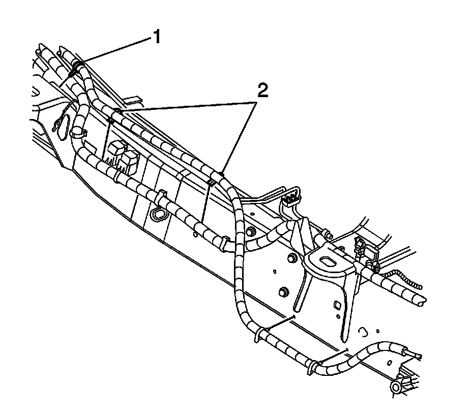 3. Remove the auxiliary positive battery cable to chassis harness clips (2).