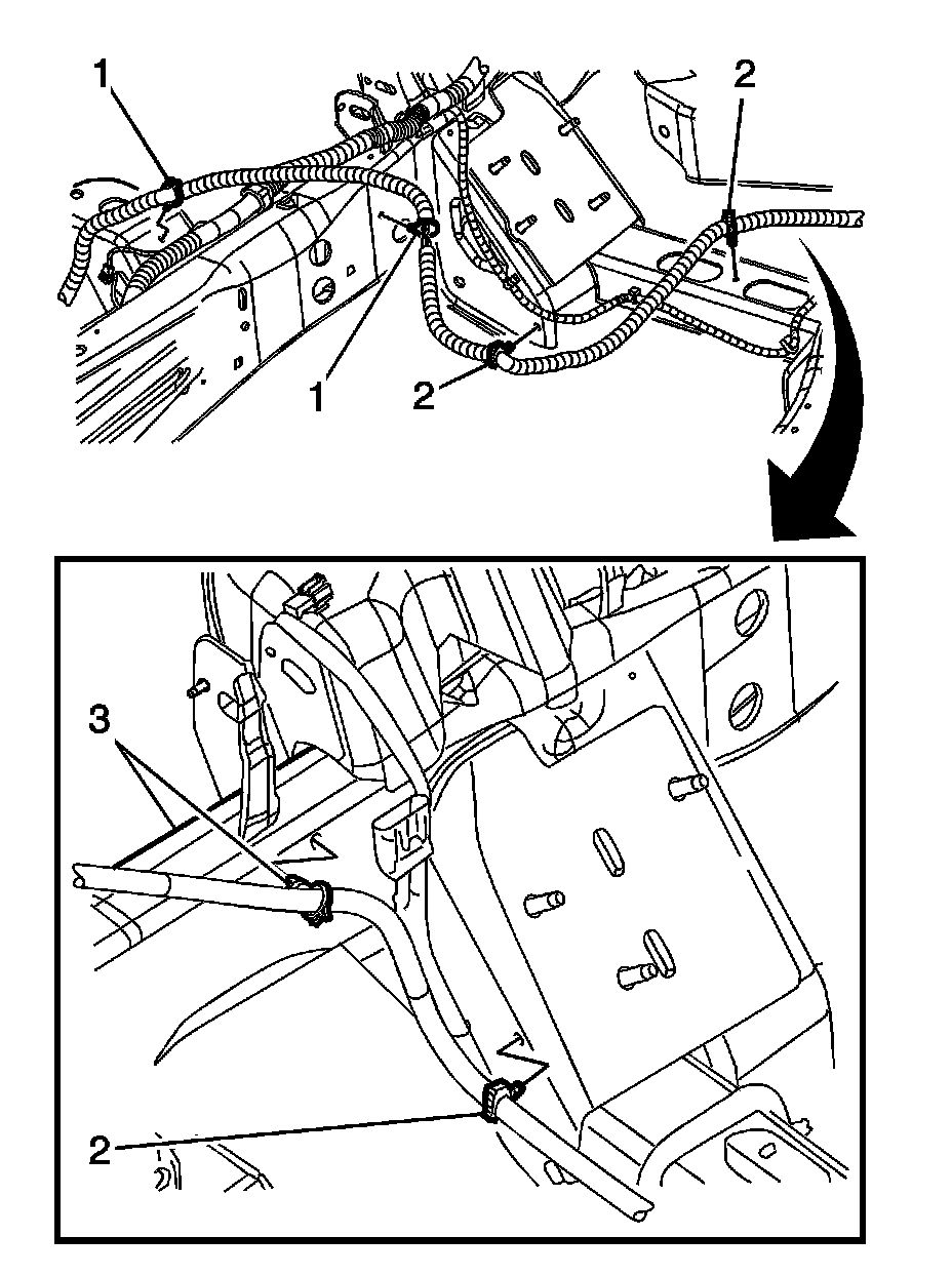 3. Install the auxiliary positive battery cable to frame clip (3).