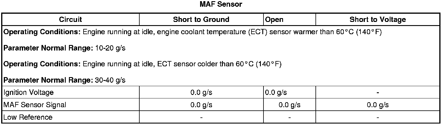 * A wide open throttle (WOT) acceleration from a stop should cause the MAF Sensor parameter on the scan tool to increase rapidly. This increase should be from 6-8 g/s at idle to greater than 380 g/s at the time of the 1-2 shift.