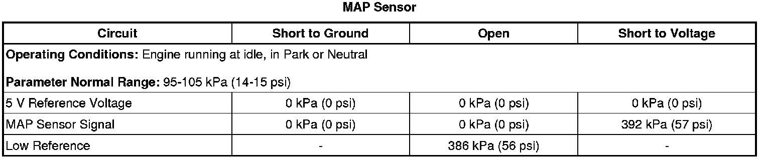 The ECM uses the MAP sensor to aid in diagnosis of the turbocharger performance. The highest manifold pressures occur when the turbocharger output is high. Manifold pressure can range from 58 kPa (8 psi) when pressures are low, to greater than 240 kPa (34 psi) when pressures are high, depending on the BARO. The MAP sensor has a range of 43-360 kPa (6-52 psi).