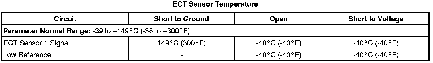 * This diagnostic runs in a specific range. Measure and record the resistance of the ECT sensor at various ambient temperatures between -7 to +80°C (+19 to +176°F), then compare those measurements to the Temperature Versus Resistance Temperature Versus Resistance table.