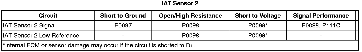 The charge air cooler (CAC) temperature sensor, intake air temperature (IAT) sensor 1, and IAT sensor 2 are variable resistors. The IAT sensor 1 is part of the Mass Air Flow (MAF/IAT) sensor assembly which is located in the intake air duct after the air cleaner assembly. The IAT sensor 2 is located in the CAC inlet duct. The CAC temperature sensor is located in the CAC outlet duct before the throttle body assembly. The engine control module (ECM) supplies 5 V to the signal circuits, and a ground for each sensor's low reference circuit. The ECM monitors the CAC temperature sensor and the IAT sensor 2 circuits in order to calculate the temperature of the fuel air. The ECM monitors the CAC sensor and IAT sensor 2 signal for excessively high or low voltages, or for a voltage that is not in correlation with the other sensor's start up signal.