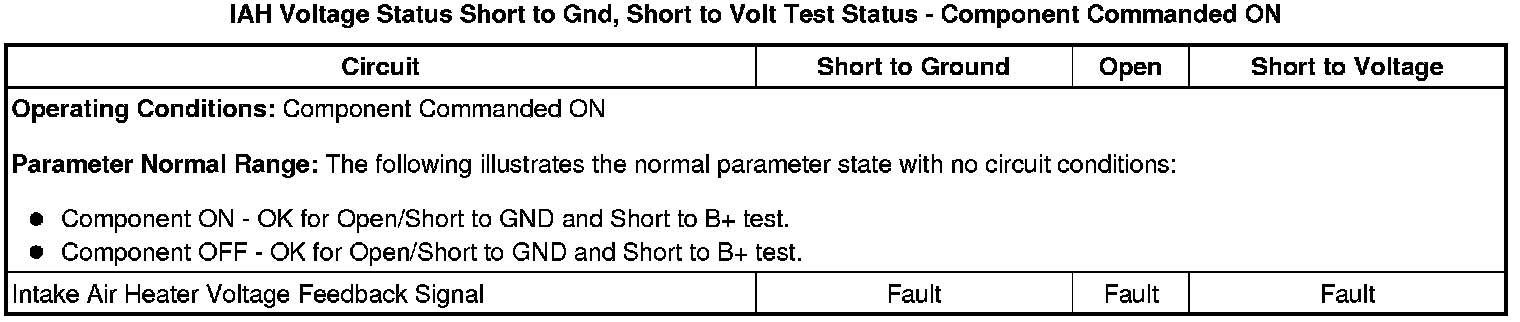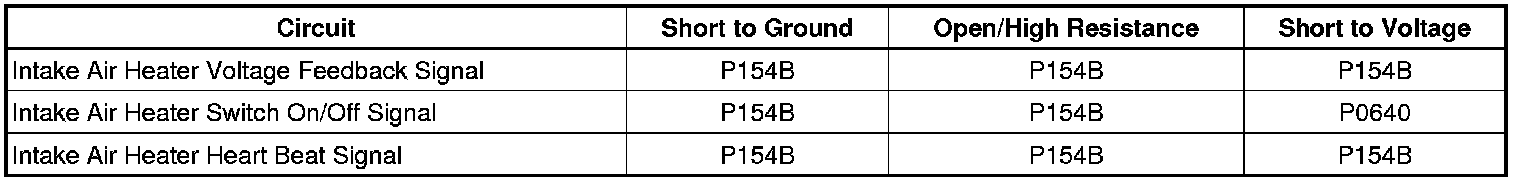 * Intake air heater signal voltage is greater than 1.5 V after the intake air heater has been commanded OFF for more than 65 ms.