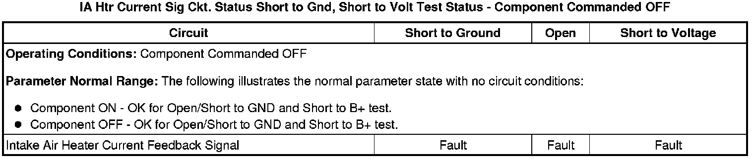 1. Engine running, command the intake air heater ON and OFF with a scan tool while observing the IA Htr Current Sig Ckt. Status parameter.