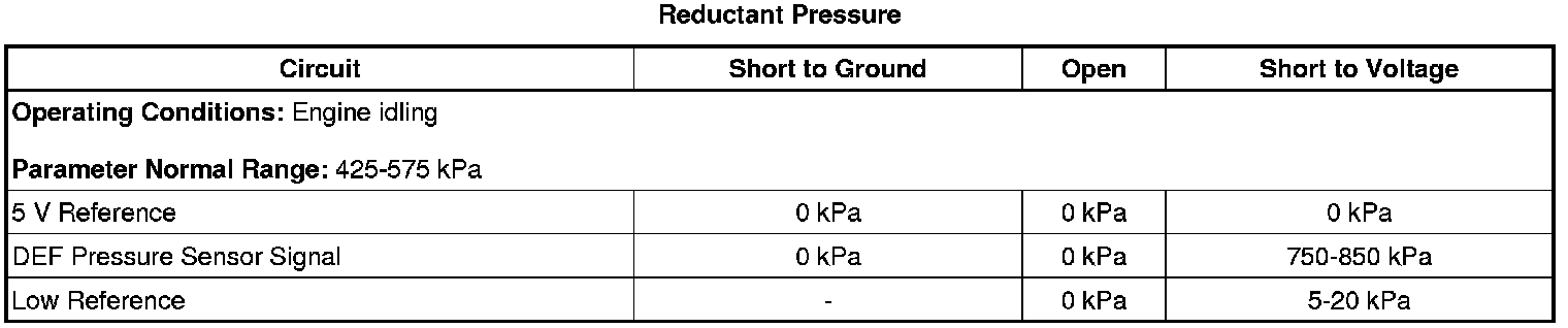 The ECM detects that the reductant pressure sensor signal is less than 0.41 V for greater than 0.4 s.