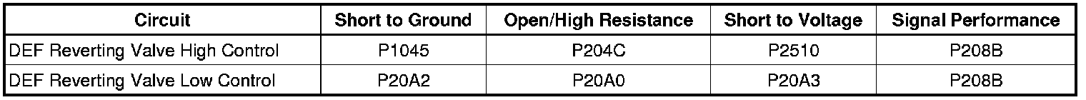 2. Ignition ON, test for 2.5-4.5 V between the DEF reverting valve high control circuit terminal A7 and ground.