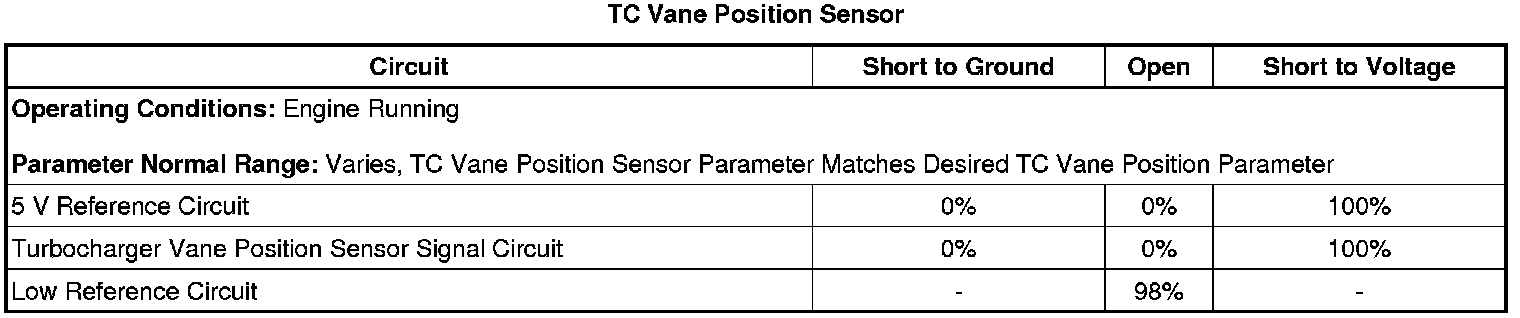 The ECM detects that the turbocharger vane position sensor voltage is less than 0.15 V for greater than 5 s.