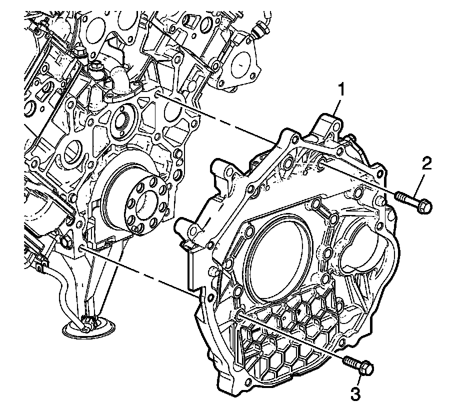 5. Install the flywheel housing bolts (2) and (3).