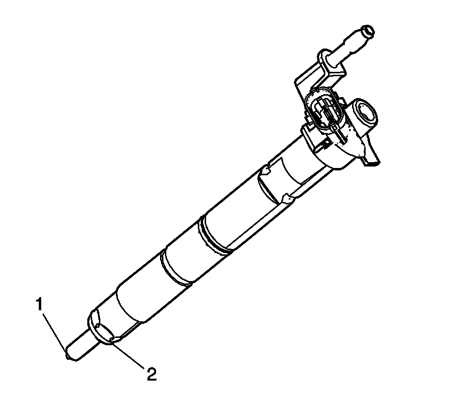 1. Use a soft bristle non-metallic brush and top engine cleaner, GM P/N 1052626 or equivalent, to remove any deposits from the nozzle tip (1) and the copper washer sealing area (2) before reinstallation.