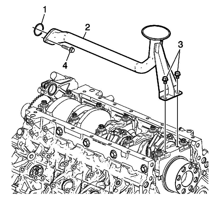 3. Install the oil pump pipe and screen assembly bolts (3) and (4) and tighten to 25 Nm (18 lb ft).