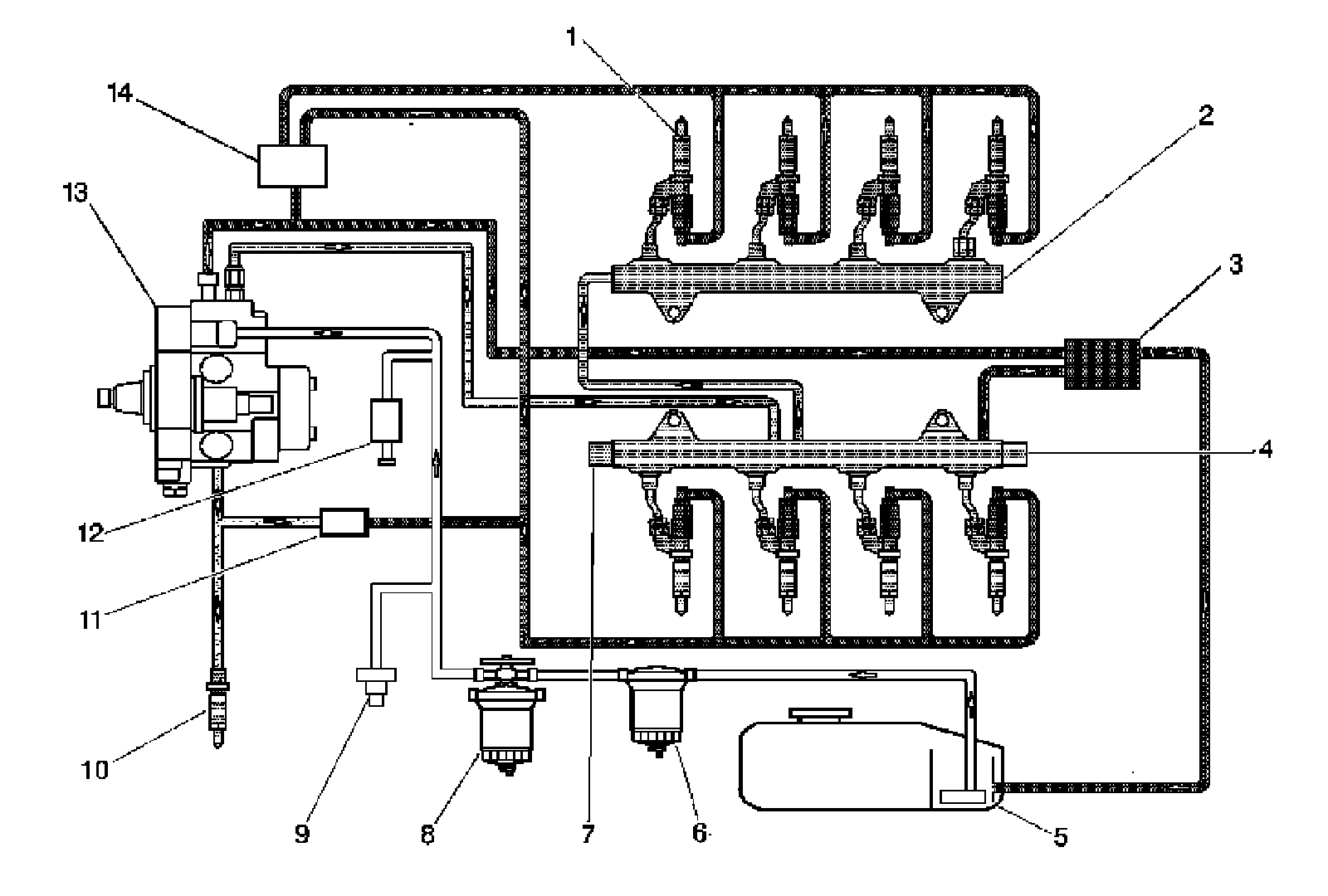 The fuel tank (5) stores the fuel supply. A mechanical fuel injection pump (13), located below the engine intake, includes the fuel supply pump and the high-pressure pump. Fuel is drawn through the diesel fuel conditioning module (8), which combines a water separator, hand operated fuel prime pump, filter element and then through a fuel filter vacuum switch (9) to the fuel injection pump. The engine control module (ECM) controls the fuel pump pressures by using two fuel pressure regulators, fuel pressure regulator 1 is located on top of the fuel injection pump and fuel pressure regulator 2 (7) is located on a fuel rail (2). The fuel pressure sensor (4) provides a voltage signal to the ECM to indicated fuel rail pressures. The high pressure fuel is supplied to the fuel injectors (1) through separate high pressure pipes. The fuel injectors supply fuel directly to the combustion chambers of the engine. The fuel that is not injected into the combustion chamber is used to help lubricate and cool the injector and is routed back to the fuel tank. The fuel injector return line pressure regulator (14) maintains fuel pressure on the return side of the fuel injectors. This is required for proper fuel injector operation. In the event the vehicle runs out of fuel a check valve (11) in the indirect fuel injector (10) supply line opens and the fuel supply pump back fills the return side with fuel.