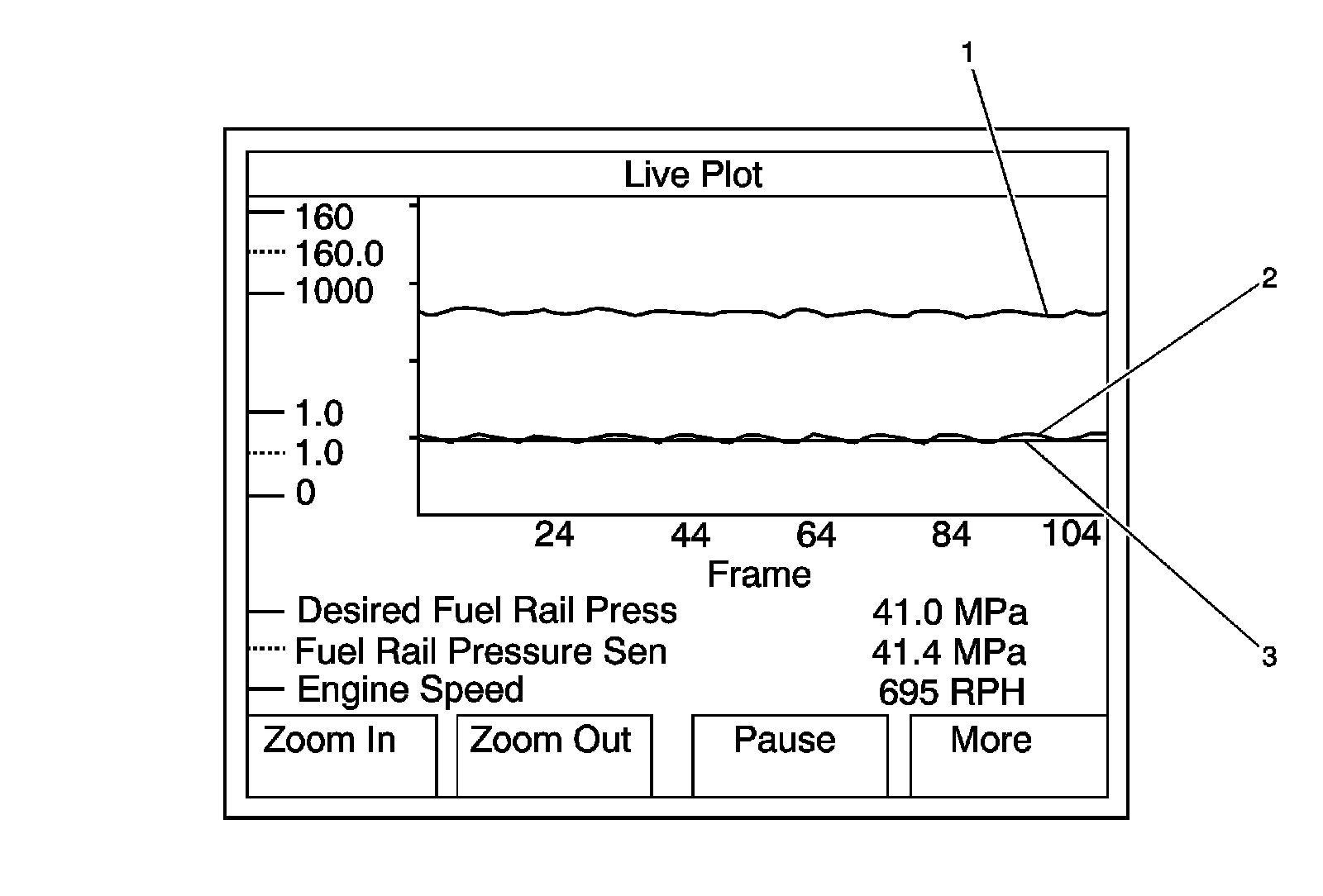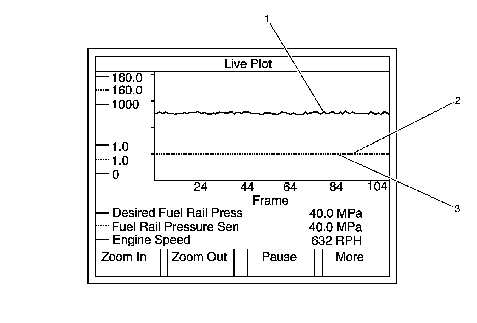 4. If there is a violent fluctuation in the Fuel Rail Pressure, as seen in the surging graph below, replace the Q45A fuel pressure regulator 1. Refer to Fuel Pressure Regulator Replacement (Service and Repair).