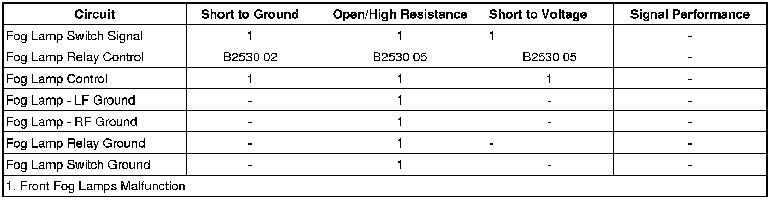 For a short to voltage condition the fog lamps and the fog lamp switch indicator will be on at all times when the park lamps are OFF and the fog lamp switch is inactive. The fog lamps and the fog lamp switch indicator will not operate when the park lamps are ON and the fog lamp switch is active.