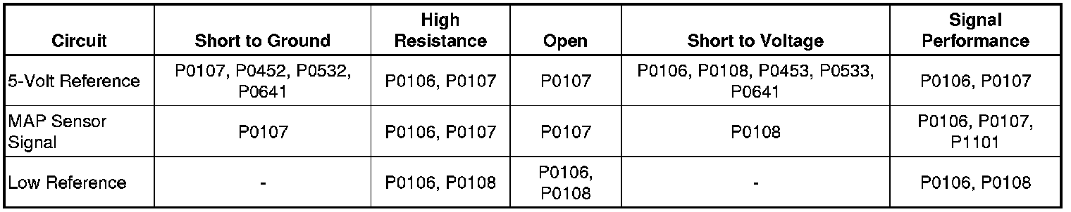 The manifold absolute pressure (MAP) sensor has a 5-volt reference circuit, a low reference circuit, and a signal circuit. The control module supplies 5 volts to the MAP sensor on a 5-volt reference circuit, and provides a ground for the low reference circuit. The MAP sensor provides a voltage signal to the control module on a signal circuit relative to the intake manifold pressure changes.