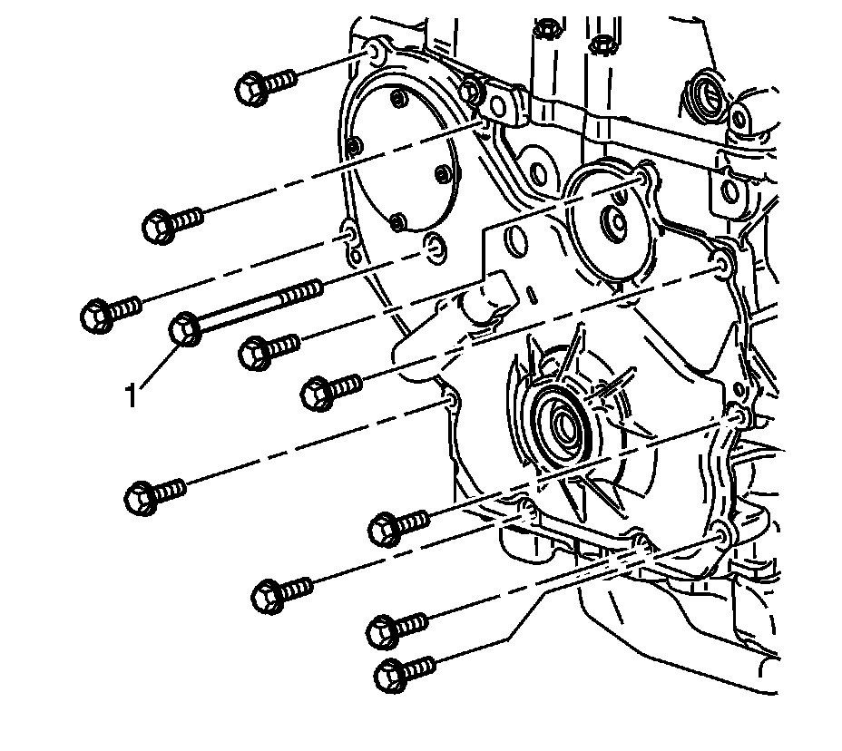 3. Install the long water pump bolt (1) and tighten to 25 Nm (18 lb ft).