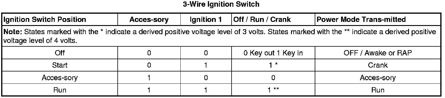 On vehicles that have several control modules connected by serial data circuits, one module is the power mode master (PMM). On this vehicle, the PMM is the body control module (BCM). The PMM receives 3 discrete ignition switch signals to differentiate which power mode will be sent over the Serial Data circuits. The 3-wire Ignition Switch table below illustrates the state of these inputs in correspondence to the ignition switch position: