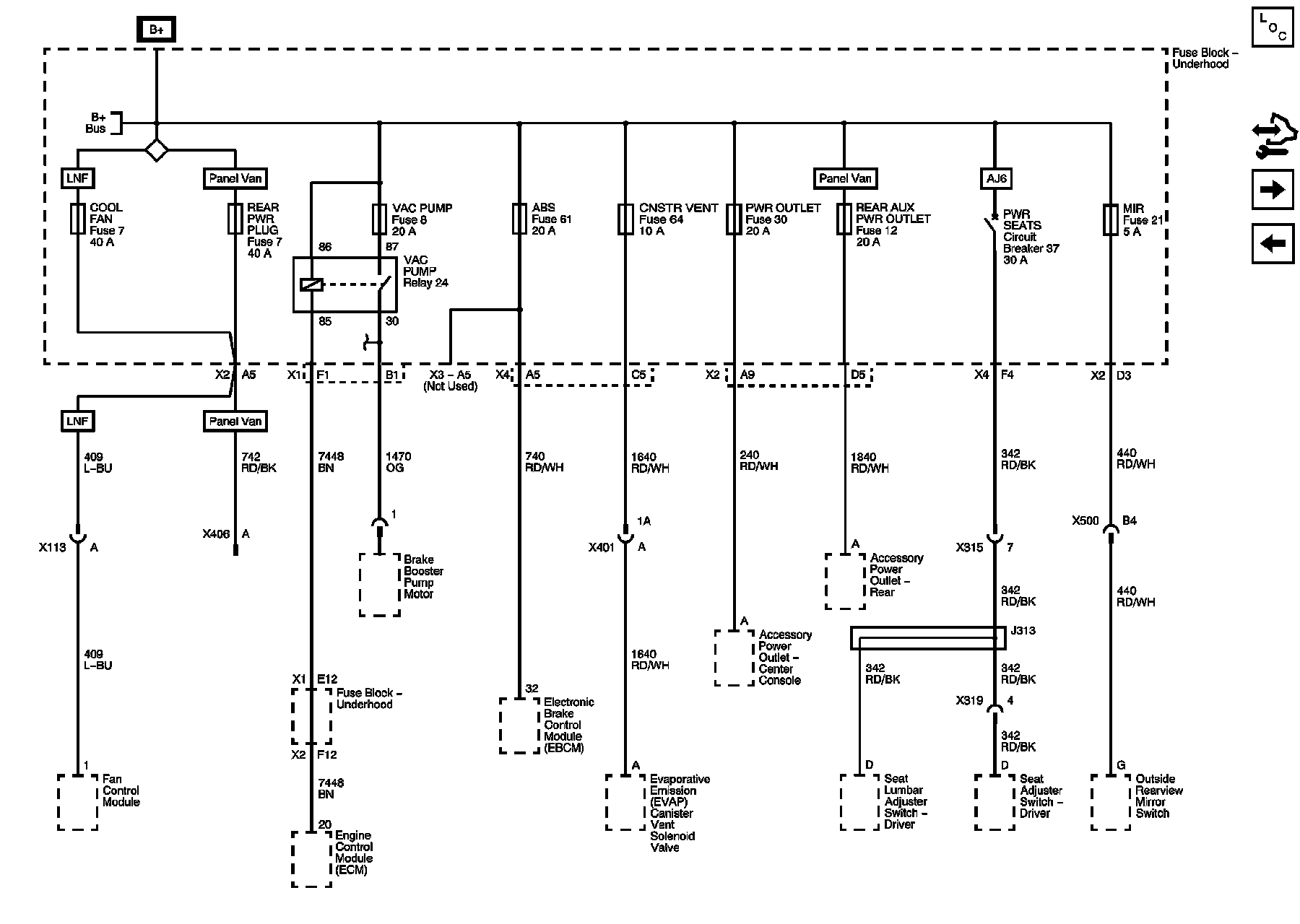ABS (20A), CNSTR VENT, COOL FAN, MIR, PWR OUTLET, REAR AUX PWR OUTLET, REAR PWR PLUG, and VAC PUMP Fuses