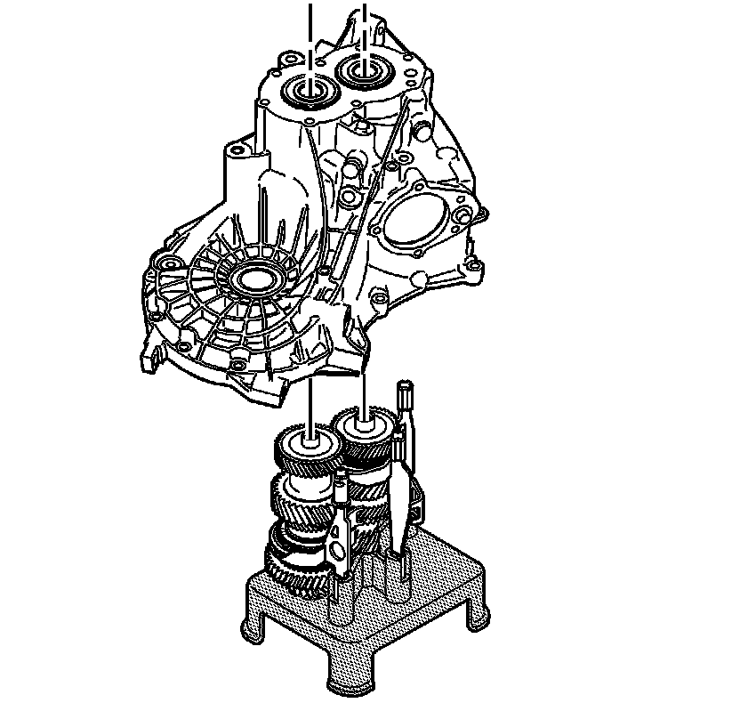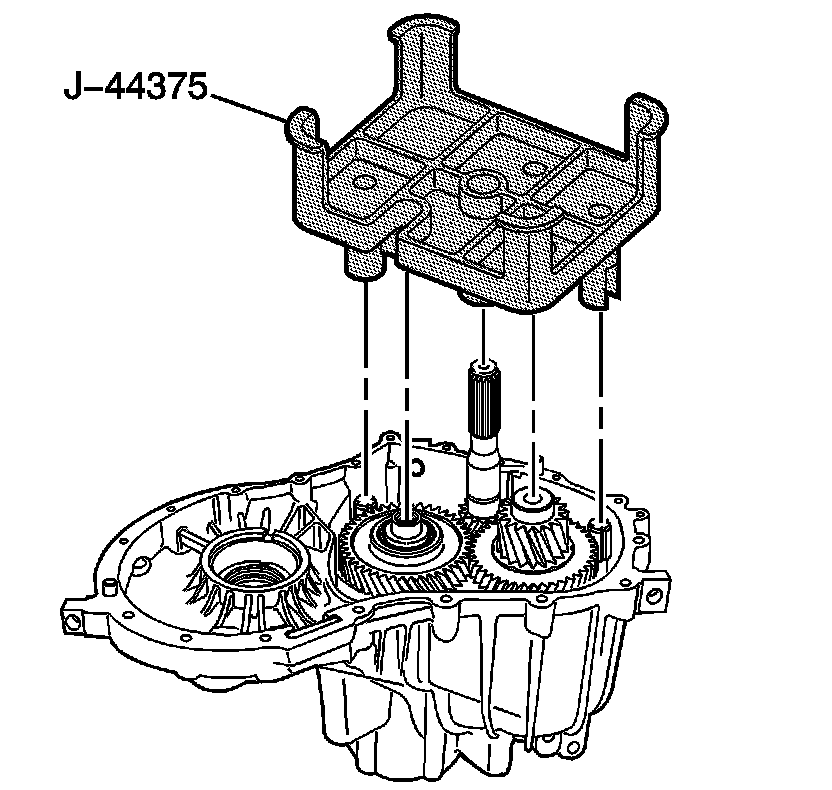 20. Install the housing onto the shift forks and the shafts on to the J 44375 - assembly pallet. Line up the shift forks and the shafts with the housing.