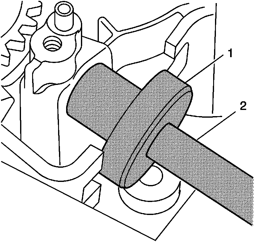 3. Install a new shifter shaft bearing flush with the casting in the transmission housing, using the J 44381 - bearing remover (1) and the 7079-2 - driver handle (2).