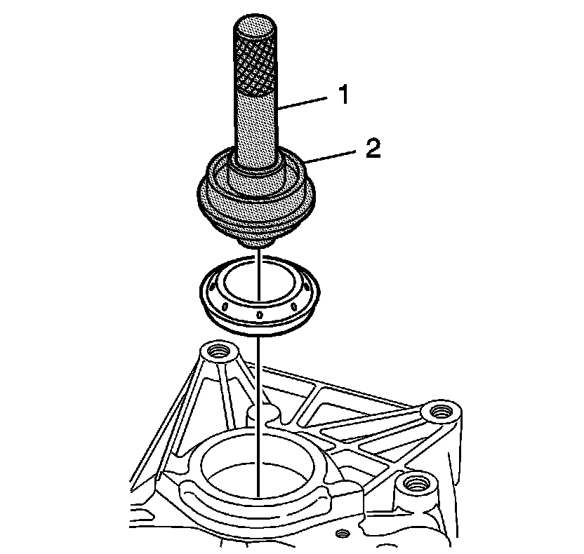 7. Install a new differential side bearing race seal to the transmission housing using the J 44385 - seal installer (2) and the 7079-2 - driver handle (1).