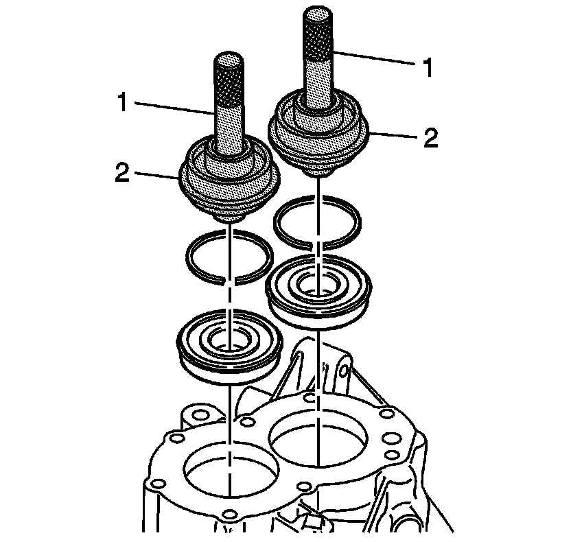 14. Install a new differential output shaft seal to the clutch housing using the J 44385 - seal installer (2) and the J 8092 - driver handle (1).