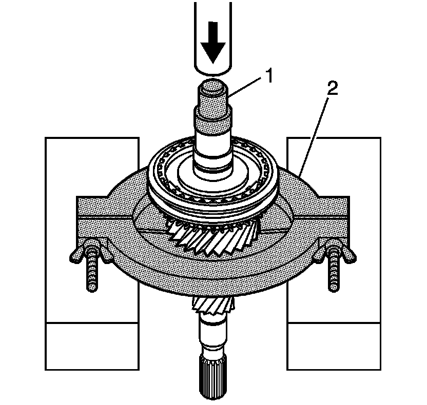 7. Remove the gear shaft components from the input shaft using the J 36513 (2) under the 3rd speed gear, the J 44378 (1), and a hydraulic press.