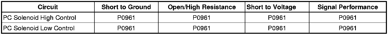 • If the resistance is less than the specified range, test the affected circuit for a short together condition. If all circuits and connections test normal, test the PC solenoid Valve for proper operation.