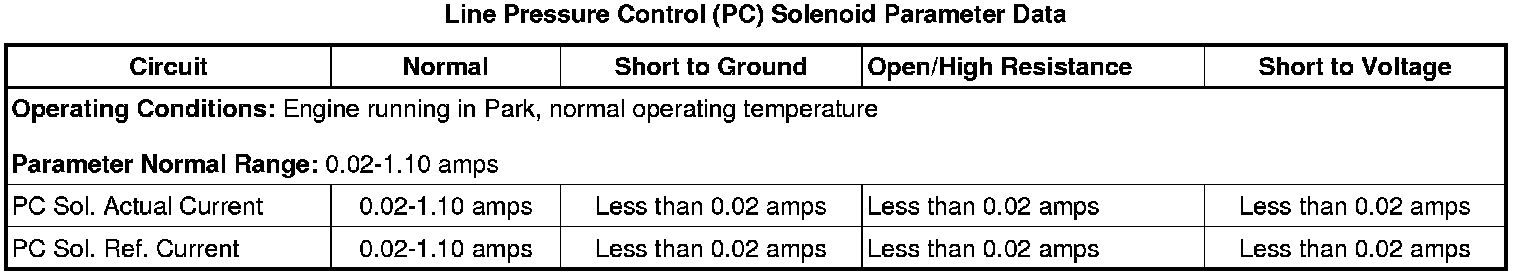The pressure control (PC) solenoid valve is an electronic device located in the valve body. The transmission control module (TCM) controls transmission line pressure by regulating the current flow through the PC solenoid valve windings. The TCM determines the appropriate line pressure for a given load by monitoring the throttle position sensor voltage, the engine speed and other inputs. The TCM then varies the duty cycle on the high side of the PC solenoid valve to control current flow to the solenoid. The magnetic field produced by the coil moves the solenoid's internal valve which varies pressure to the pressure regulator valve. The TCM controls the PC solenoid valve by applying a varying amount of amperage to the solenoid. The applied amperage can vary from 0.1-1.1 amps. Low amperage, 0.1 amp, indicates high line pressure. High amperage, 1.1 amps, indicates low line pressure. The duty cycle of the PC solenoid valve is expressed as a percentage of energized ON time. Zero percent indicates zero ON time, non-energized, or no current flow. Approximately 60 percent at idle indicates maximum ON time, energized, or high current flow. Current is controlled from about 0.02 amp for maximum line pressure to 1.1 amps for minimum line pressure. The TCM monitors the actual current to the solenoid as compared to the requested or reference current.