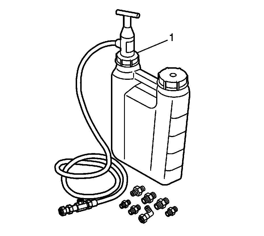 4. Pump the handle on the EN-45299 - preluber (1) in order to flow a minimum of 1-1.9 liters (1-2 quarts) of engine oil. Observe the flow of engine oil through the flexible hose and into the engine assembly.