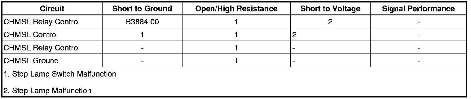 The BCM detects a short to ground in the CHMSL relay control circuit when the stop lamps are commanded ON.