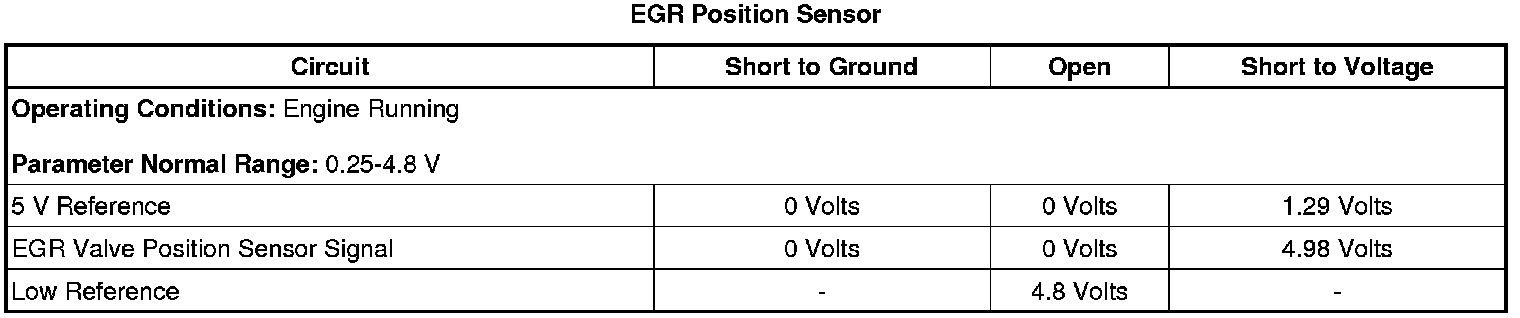 The engine control module (ECM) uses the exhaust gas recirculation (EGR) position sensor to determine the position of the EGR valve. The ECM sends a reference voltage through the 5-volt reference circuit to the EGR position sensor. The ECM provides a voltage return path for the sensor through the low reference circuit. A variable voltage signal, based on the EGR valve position, is sent from the sensor to the ECM through the EGR position sensor signal circuit. The ECM compares the actual EGR position with the desired EGR position when the EGR valve is commanded open or closed.
