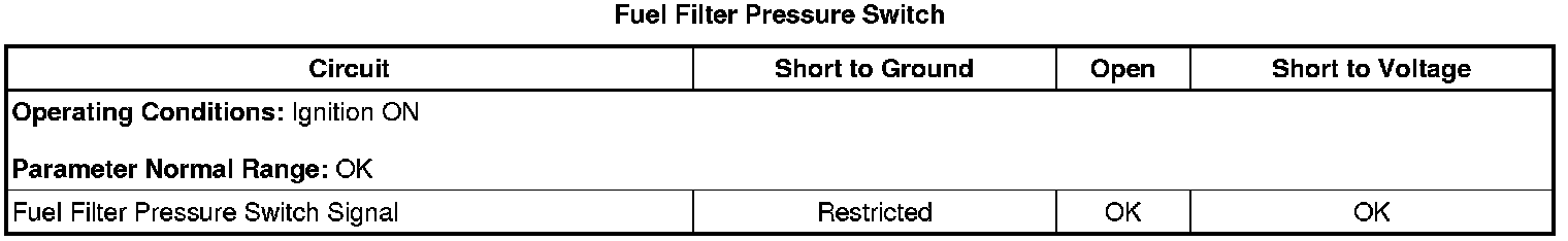 1. Ignition ON, verify the scan tool Fuel Filter Pressure Switch parameter displays OK.