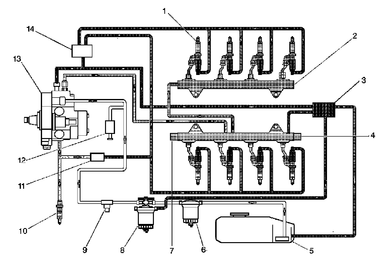 The fuel tank (5) stores the fuel supply. A mechanical fuel injection pump (13), located below the engine intake, includes the fuel supply pump and the high-pressure pump. Fuel is drawn through the diesel fuel conditioning module (8), which combines a water separator, hand operated fuel prime pump, filter element and then through a fuel filter vacuum switch (9) to the fuel injection pump. The engine control module (ECM) controls the fuel pump pressures by using two fuel pressure regulators, fuel pressure regulator 1 is located on top of the fuel injection pump and fuel pressure regulator 2 (7) is located on a fuel rail (2). The fuel pressure sensor (4) provides a voltage signal to the ECM to indicated fuel rail pressures. The high pressure fuel is supplied to the fuel injectors (1) through separate high pressure pipes. The fuel injectors supply fuel directly to the combustion chambers of the engine. The fuel the is not injected into the combustion chamber is used to help lubricate and cool the injector and is routed back to the fuel tank. The fuel injector return line pressure regulator (14) maintains fuel pressure on the return side of the fuel injectors. This is required for proper fuel injector operation. In the event the vehicle runs out of fuel a check valve (11) in the indirect fuel injector (10) supply line opens and the fuel supply pump back fills the return side with fuel.