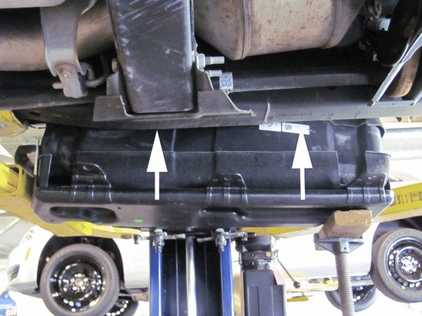 13. Install the new design DEF tank straps and fasteners and tighten fasteners to 22 Nm (16 lb ft). The new tank straps incorporate the outer shield attachment points.