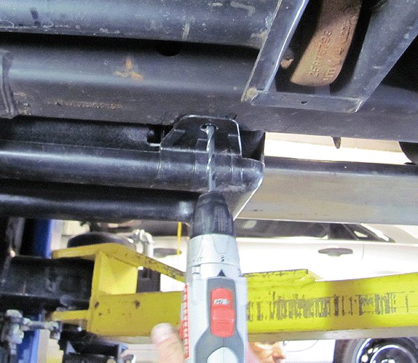 17. Drill three 7.25 mm (9/32 in) DEF tank mounting holes into the frame as shown in the illustration.