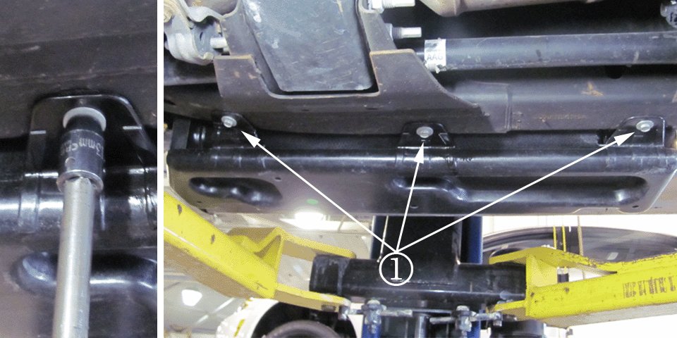 18. Install three DEF tank mounting bolts (1) and tighten them to 12 Nm (9 lb ft).